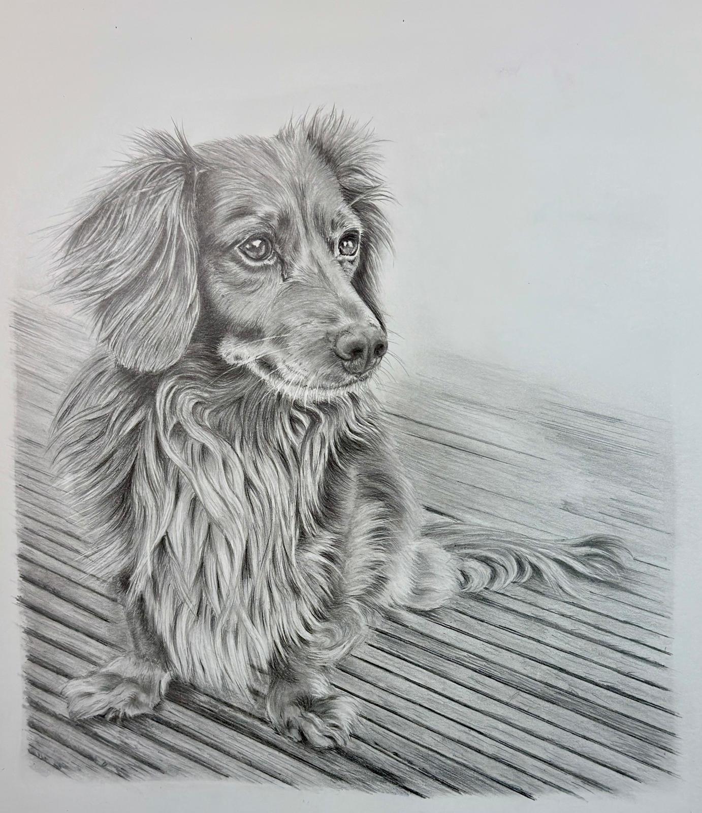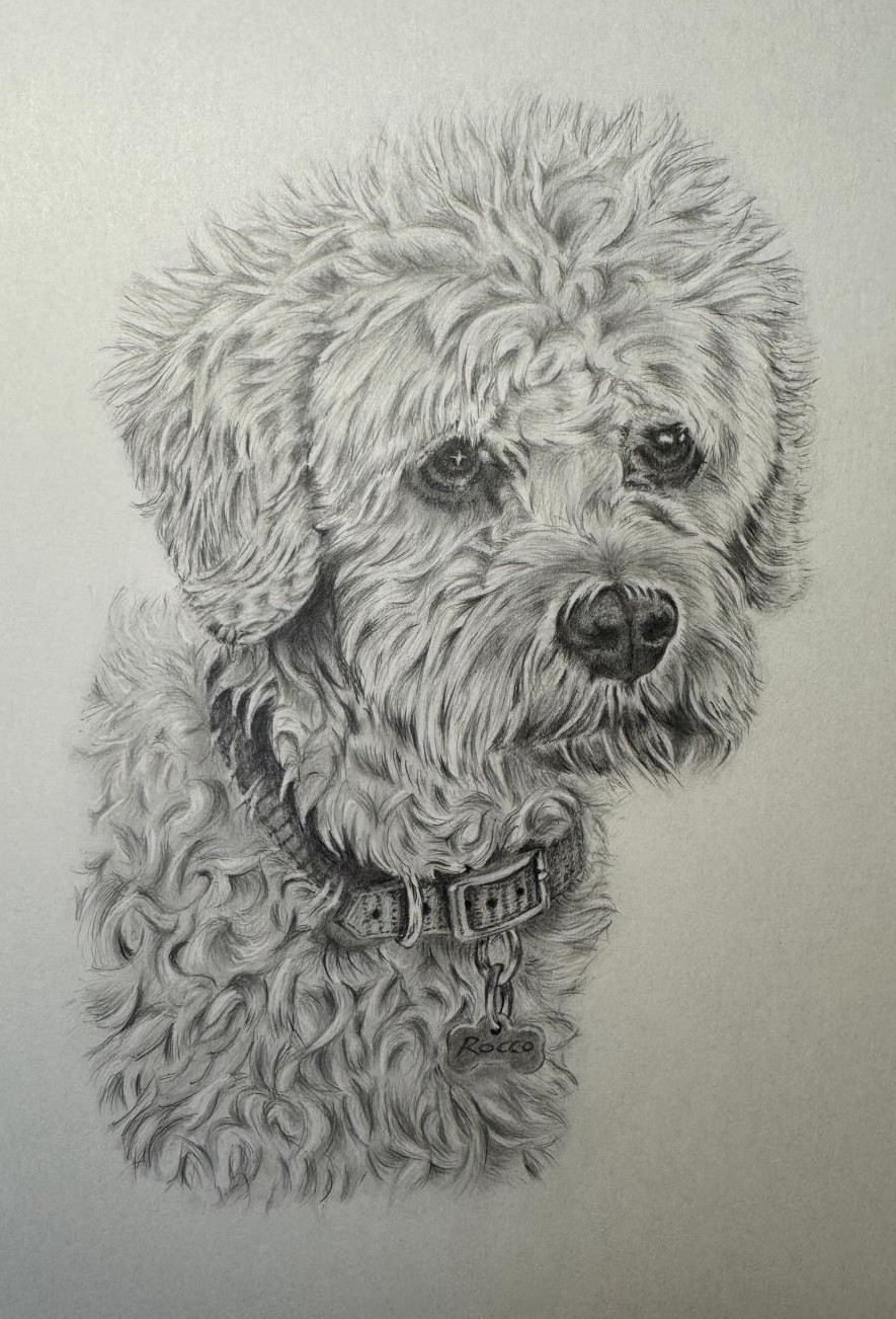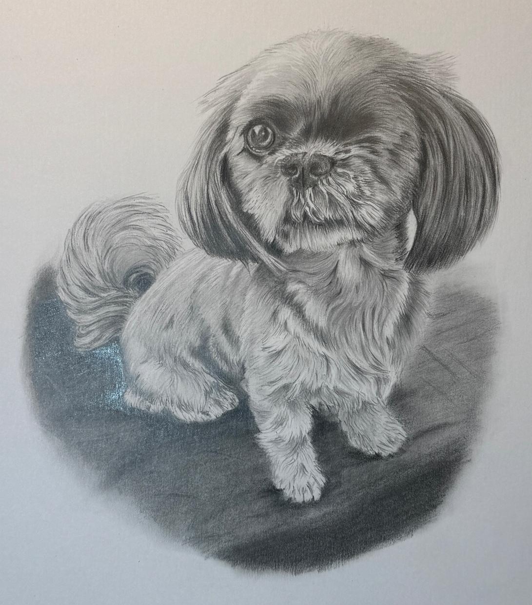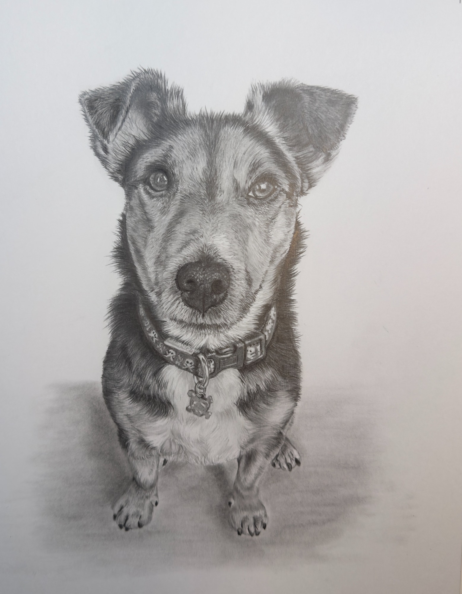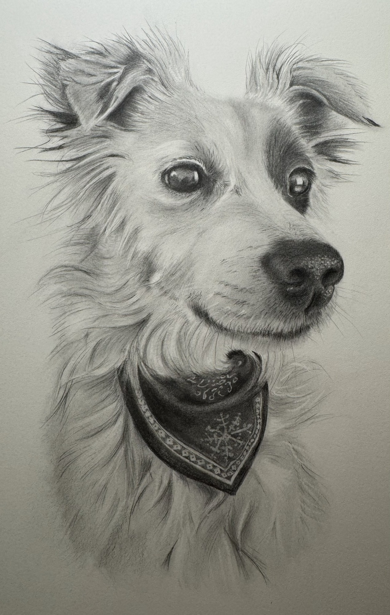The original collar was changed in the drawing at owners request, and a good suggestion. He is fluffy chap!