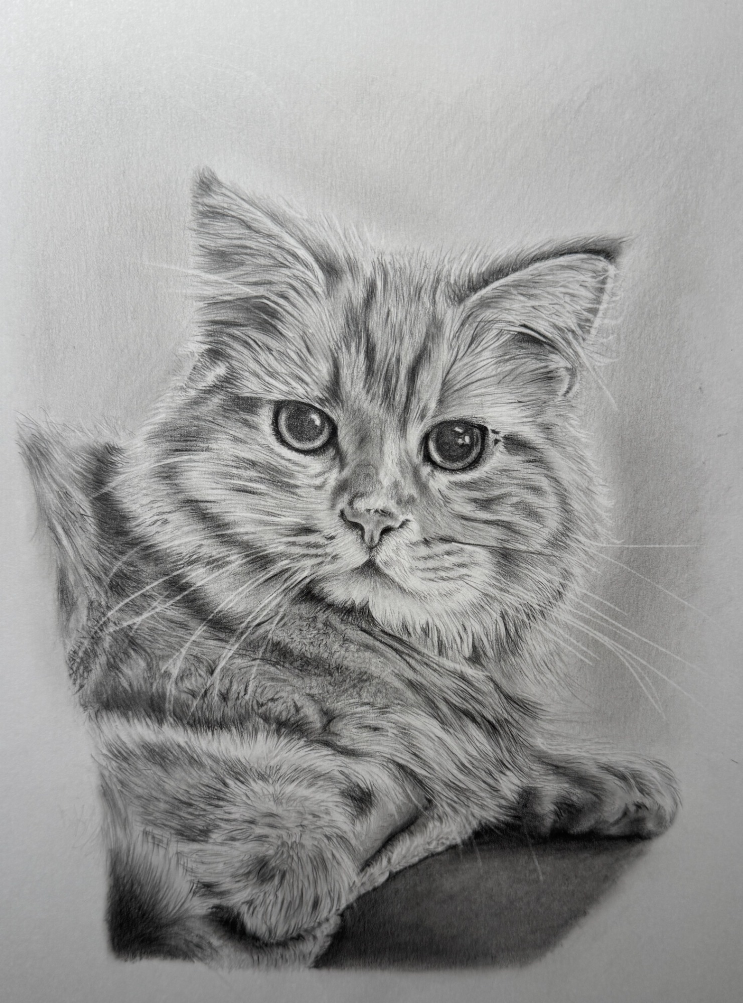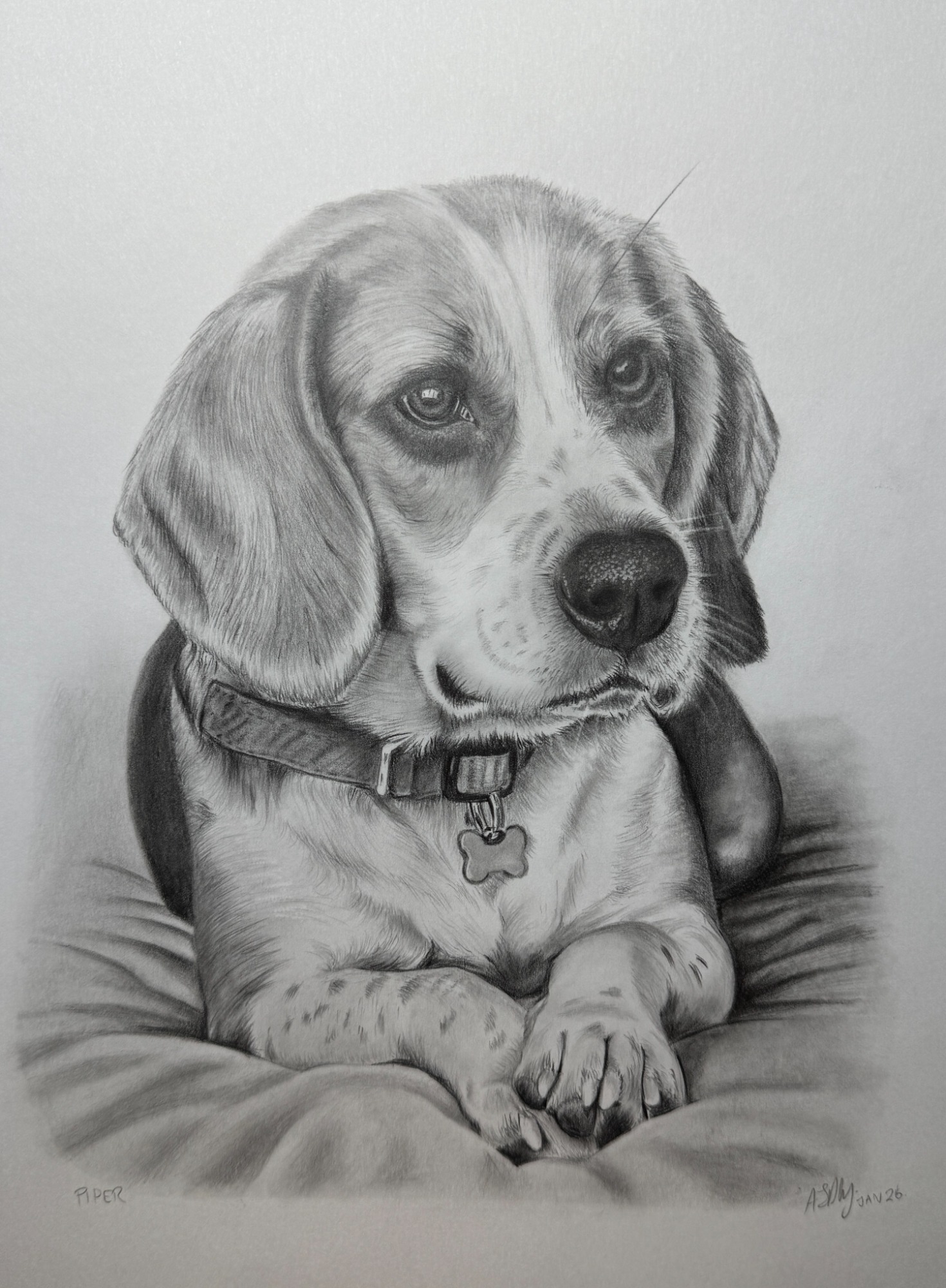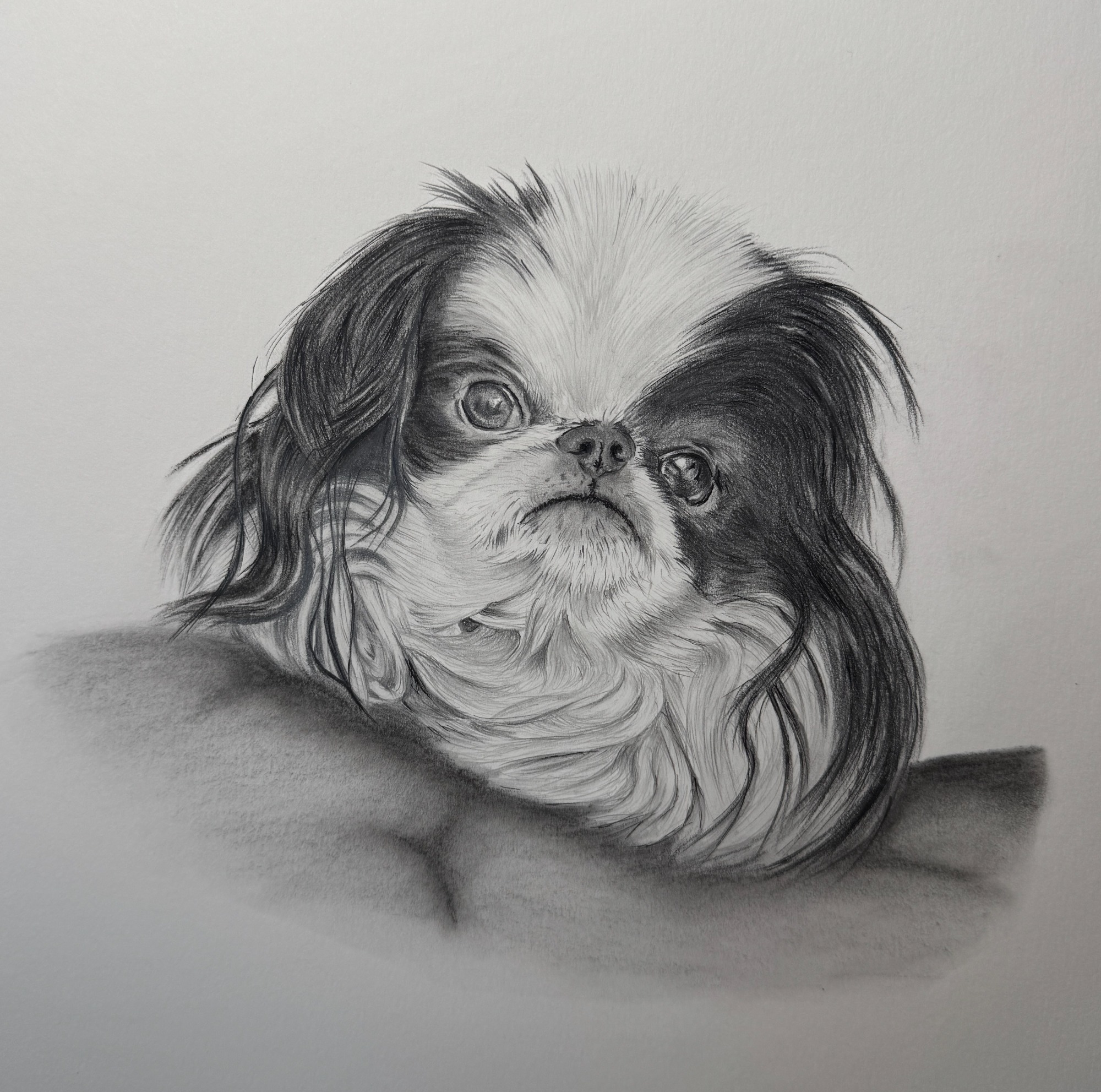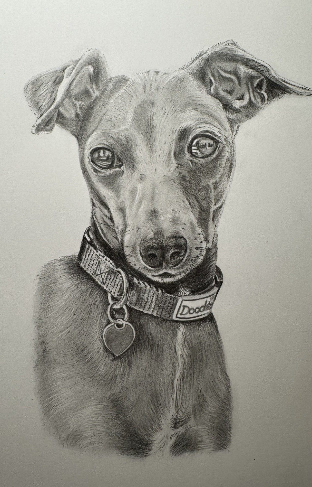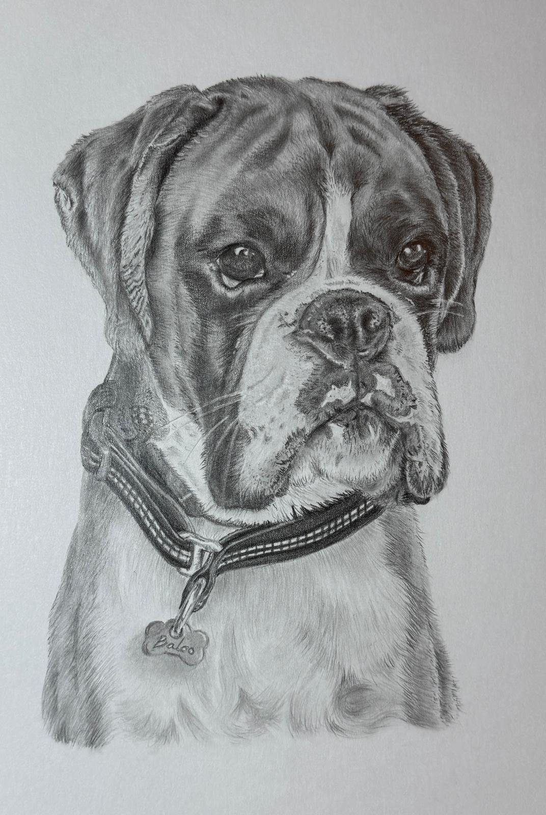The original collar was changed in the drawing at owners request, and a good suggestion. He is fluffy chap!