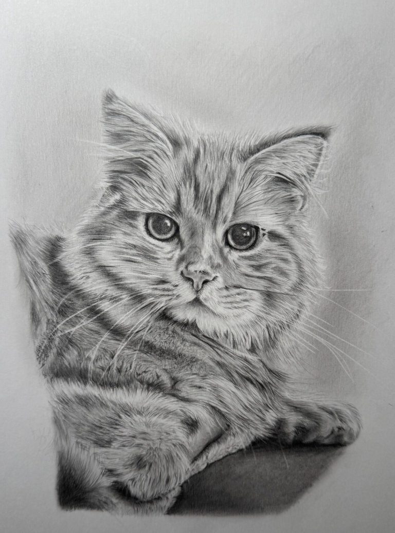 “Somerset Arts produced an amazing drawing of our boy Fergus. Up close all the details of our gorgeous cat is there and more. His whiskers and the detail in his eyes is the most impressive part to us. Thank you Andrew!”